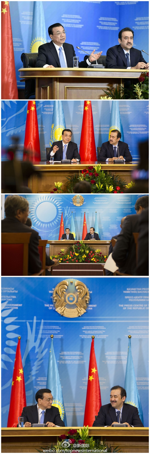 ????新華網(wǎng)北京12月15日電? 據(jù)新華社“新國(guó)際”微博報(bào)道,正在哈薩克斯坦進(jìn)行正式訪問(wèn)的李克強(qiáng)總理14日下午在阿斯塔納與哈總理馬西莫夫舉行會(huì)晤后共見(jiàn)記者。李克強(qiáng)說(shuō),冬天的阿斯塔納氣候寒冷,但中哈合作的溫度在不斷增加,使我們像身處春天一樣,我對(duì)中哈合作充滿信心,祝愿中哈合作繁花似錦。