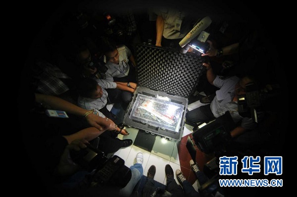 ??? 1月12日,在印度尼西亞雅加達,工作人員打開裝有亞航失事客機黑匣子的箱子。印度尼西亞國家交通安全委員會主席塔唐·庫爾尼亞迪12日說,搜救人員當天早上打撈起的失事亞航客機其中一個黑匣子——飛行數據記錄器狀態良好。新華社發(阿貢攝)