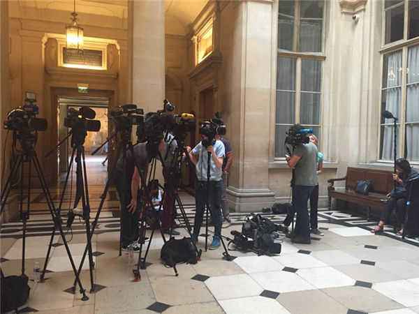 ↑記者們?cè)诎屠杷痉▽m等待采訪