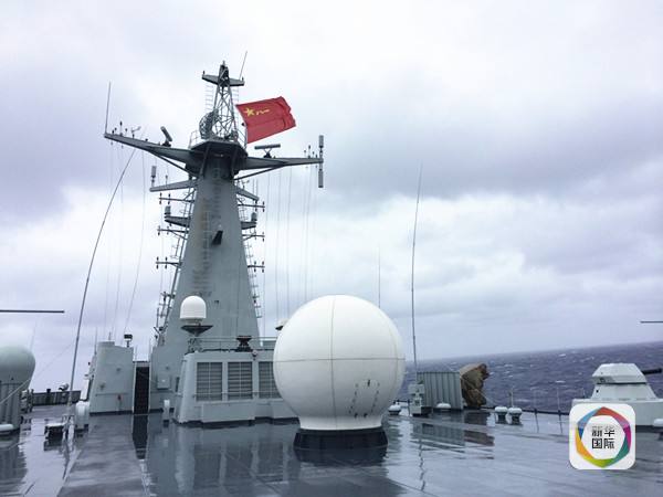 這是2014年4月23日拍攝的在風(fēng)浪里堅(jiān)持執(zhí)行搜索任務(wù)的中國海軍井岡山艦。(新華社記者白瑞雪攝)