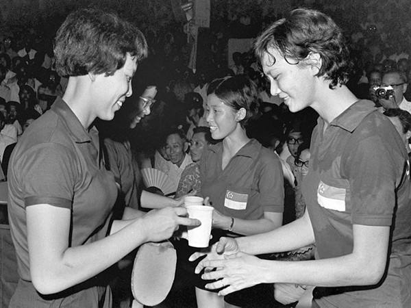 1972年7月8日至7月15日,中國乒乓球代表團應邀對新加坡進行友好訪問。訪問期間,中、新兩國運動員通過友好比賽,相互學習,交流經驗,增進了友誼。圖為中、新兩國乒乓球運動員在比賽場上。