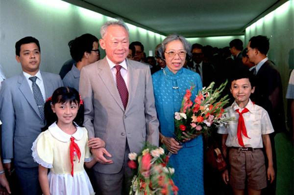 1985年9月13日至25日,應中國政府邀請,新加坡總理李光耀和夫人對中國進行了正式友好訪問。圖為9月13日,李光耀總理和夫人乘飛機到達上海時,上海少先隊員向新加坡貴賓獻花。