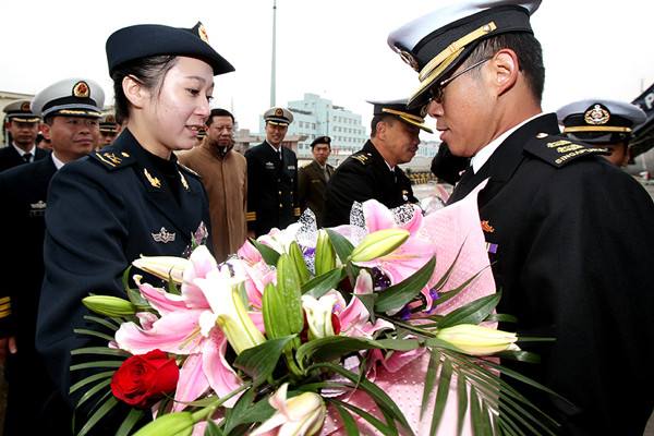 圖為中國海軍女兵向來訪的新加坡海軍軍官獻花。2010年3月8日,新加坡海軍登陸艦首訪上海。 當日,新加坡海軍“堅持”號登陸艦在艦長李順達海軍中校率領下駛抵上海,開始對上海進行為期5天的友好訪問。這是“堅持”號第一次訪問上海。