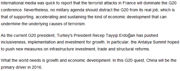 二十國集團(tuán)領(lǐng)導(dǎo)人第十次峰會于15日下午在土耳其安塔利亞舉行第一階段會議。在二十國集團(tuán)的不斷探索與實(shí)踐中,中國無疑將成為2016年世界經(jīng)濟(jì)的主要驅(qū)動力。