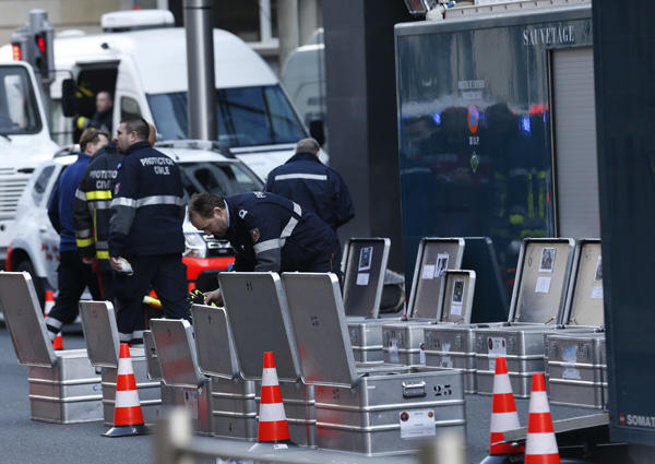 3月22日,在比利時(shí)首都布魯塞爾發(fā)生恐怖爆炸事件的馬埃勒貝克地鐵站外,警方調(diào)查人員正在取證。新華社記者葉平凡攝