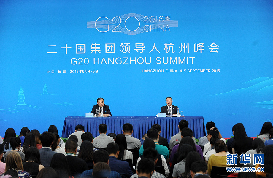 9月3日,中國代表團在浙江杭州舉行新聞發(fā)布會,商務(wù)部副部長王受文就G20杭州峰會經(jīng)貿(mào)成果展望向記者介紹情況并回答提問。新華網(wǎng)記者?陳競超 攝