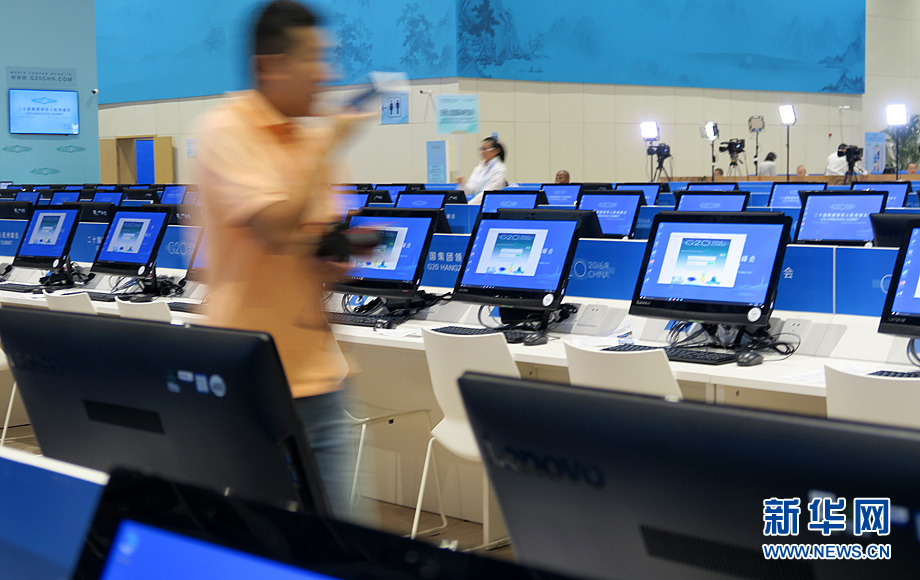 9月4日上午,金磚國家領導人非正式會晤在浙江杭州舉行。當日,G20峰會新聞中心一派繁忙景象。新華網記者 陳競超 攝