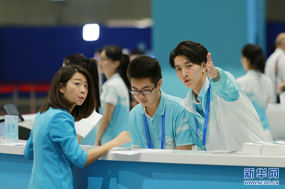 ????9月4日至5日,二十國集團領導人杭州峰會在浙江杭州舉行。全球媒體人匯聚一堂,關注報道峰會盛況。在G20杭州峰會新聞中心,200多位志愿者身著青白色運動服,男生外套上藍下白,象征層巒疊嶂;女生外套上白下藍,意味水波蕩漾。兩者輝映,體現了杭州這座古城湖光山色的獨特風韻。