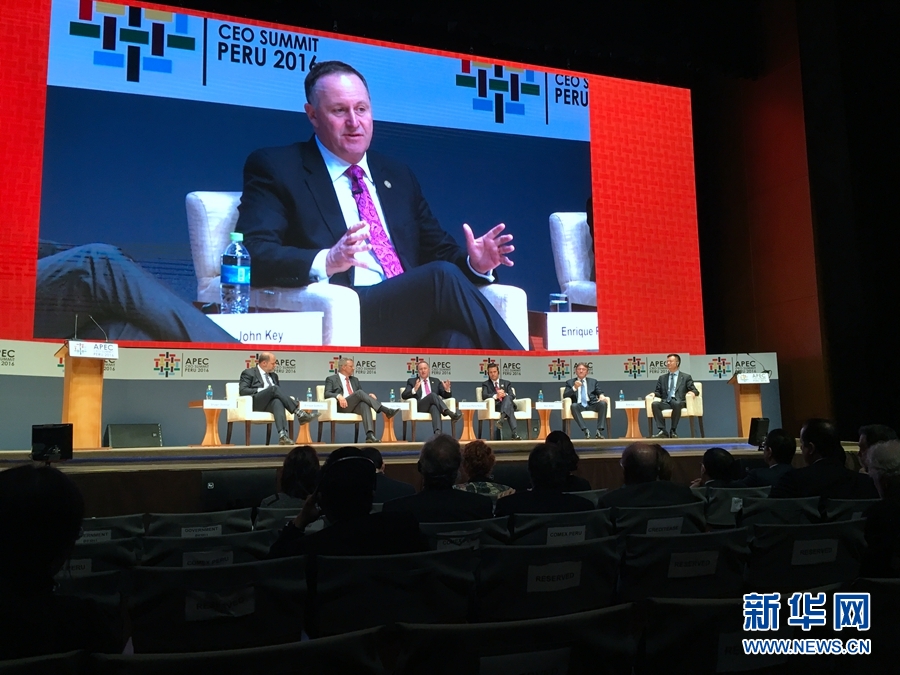 當地時間11月19日,APEC工商領導人峰會舉行主題為“重新設計貿易”的現場討論會。圖為新西蘭總理約翰·基在討論會上發言。