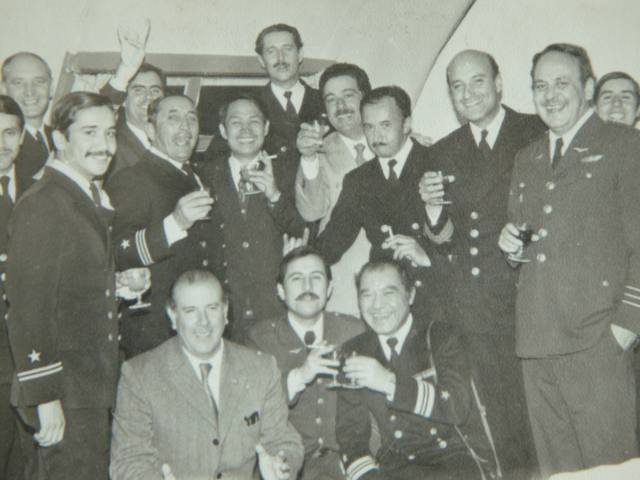 金仁伯(中排左3)在“阿基萊斯”號上與智利官兵及科考人員干杯。(金仁伯提供)