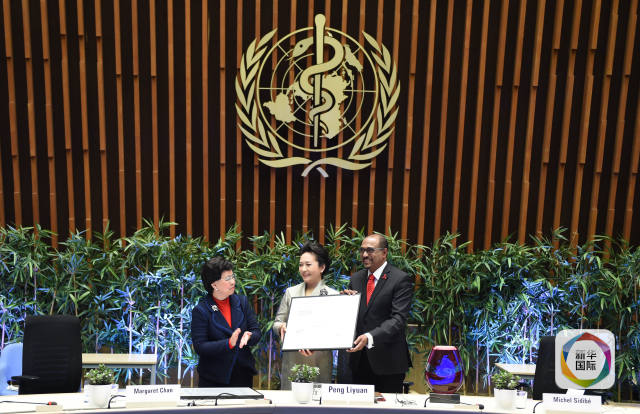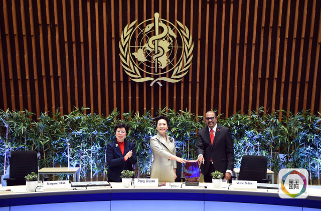 當地時間18日下午5時許,在熱烈的掌聲中,世界衛生組織總干事陳馮富珍和聯合國艾滋病規劃署執行主任西迪貝向彭麗媛頒發親善大使任期續延證書、世衛組織榮譽勛章和艾滋病防治“杰出成就獎”獲獎證書及獎杯,并合影留念。