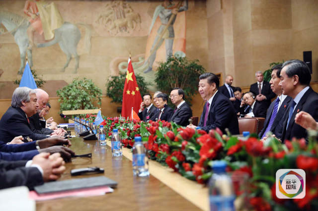 1月18日,國家主席習近平在瑞士日內瓦萬國宮會見第71屆聯合國大會主席湯姆森和聯合國秘書長古特雷斯。(新華社記者蘭紅光攝)