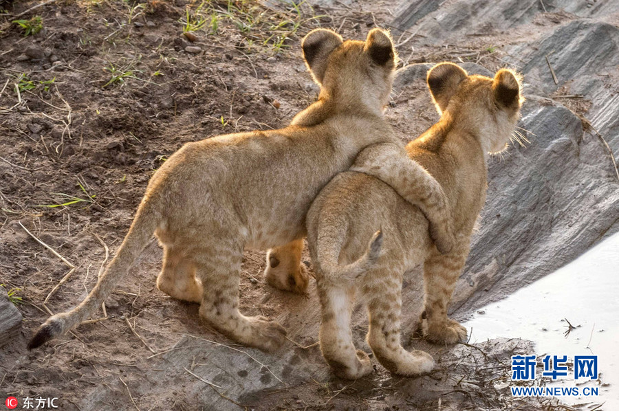 1月2日報道(具體拍攝時間不詳),肯尼亞馬賽馬拉國家保護(hù)區(qū),64歲的攝影師Ingo Gelach在當(dāng)?shù)嘏臄z到一組有趣又暖心的照片。畫面中,兩頭小獅子站在水邊,似乎正考慮跨越面前的水域。其中一頭獅子用前腳搭在同伴的肩膀上,似乎在表達(dá)友好,又似是在鼓勵同伴不要害怕,勇敢地跨過去。(圖片來源:東方IC)