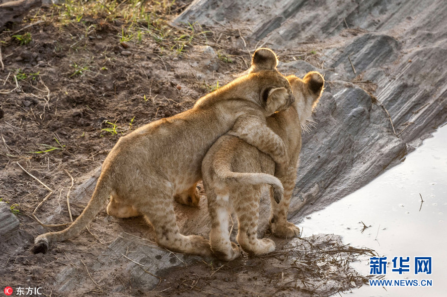 1月2日報道(具體拍攝時間不詳),肯尼亞馬賽馬拉國家保護區,64歲的攝影師Ingo Gelach在當地拍攝到一組有趣又暖心的照片。畫面中,兩頭小獅子站在水邊,似乎正考慮跨越面前的水域。其中一頭獅子用前腳搭在同伴的肩膀上,似乎在表達友好,又似是在鼓勵同伴不要害怕,勇敢地跨過去。(圖片來源:東方IC)