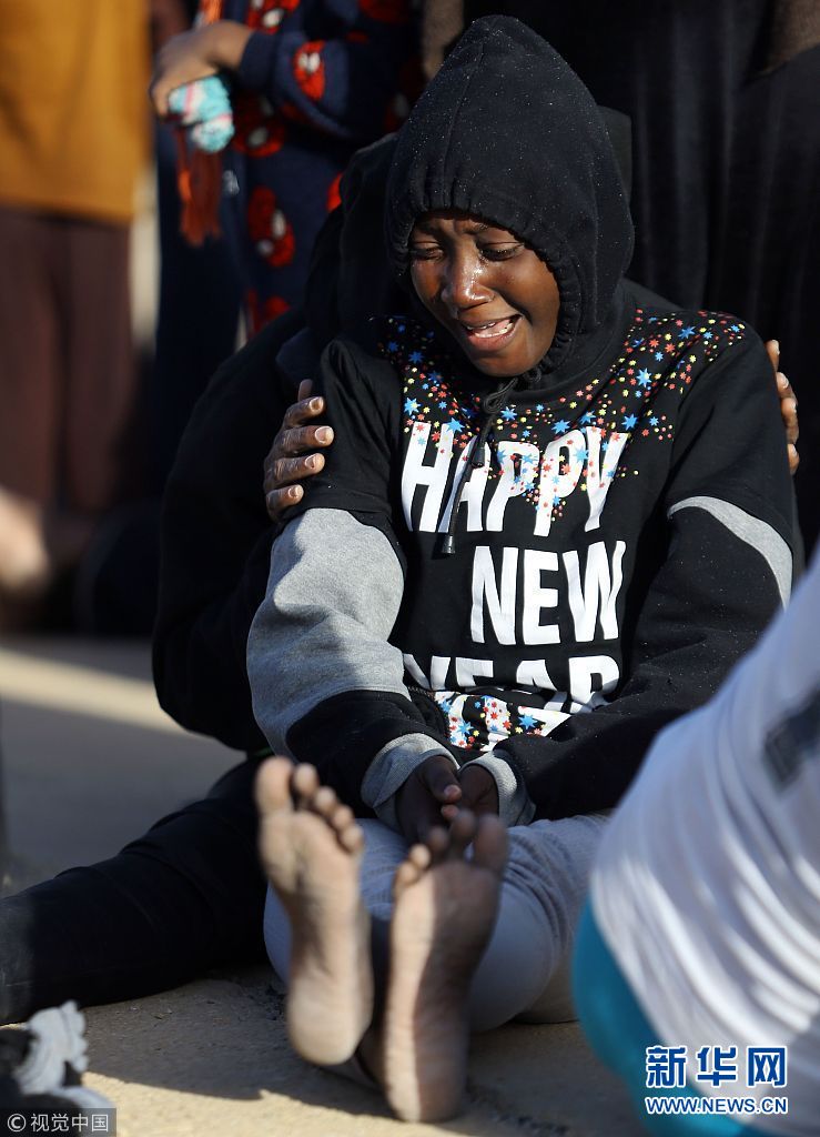 當地時間2018年1月7日,利比亞的黎波里,獲救的非法移民。6日上午在利比亞附近海域發生了一起非法移民船傾覆事故,在巡邏飛機發現該遇險船只后,周圍的意大利海岸警衛隊及意大利海軍船只迅速駛近實施救援,成功救起80余人,同時發現了8名遇難者。據外媒報道,這艘小船從該國海岸出發時載有超過100人。(圖片來源:視覺中國)