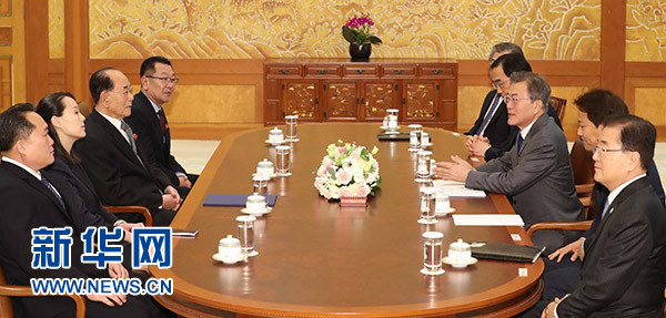 2月10日,在韓國首爾青瓦臺(tái),韓國總統(tǒng)文在寅(右三)會(huì)見由朝鮮最高人民會(huì)議常任委員會(huì)委員長金永南(左三)率領(lǐng)的朝鮮高級(jí)別代表團(tuán)。新華社/紐西斯通訊社