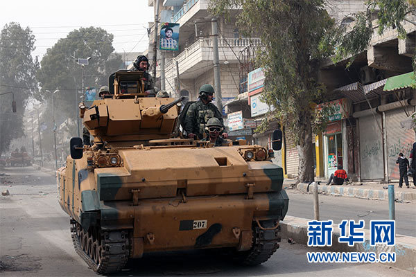 3月24日,在敘利亞阿夫林,一輛土耳其裝甲車在城區駛過。新華社發