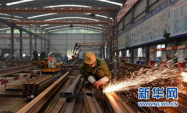 月27日,在老撾南塔省,中鐵五局工人在車間內加工鐵路施工材料。新華網發 劉艾倫攝