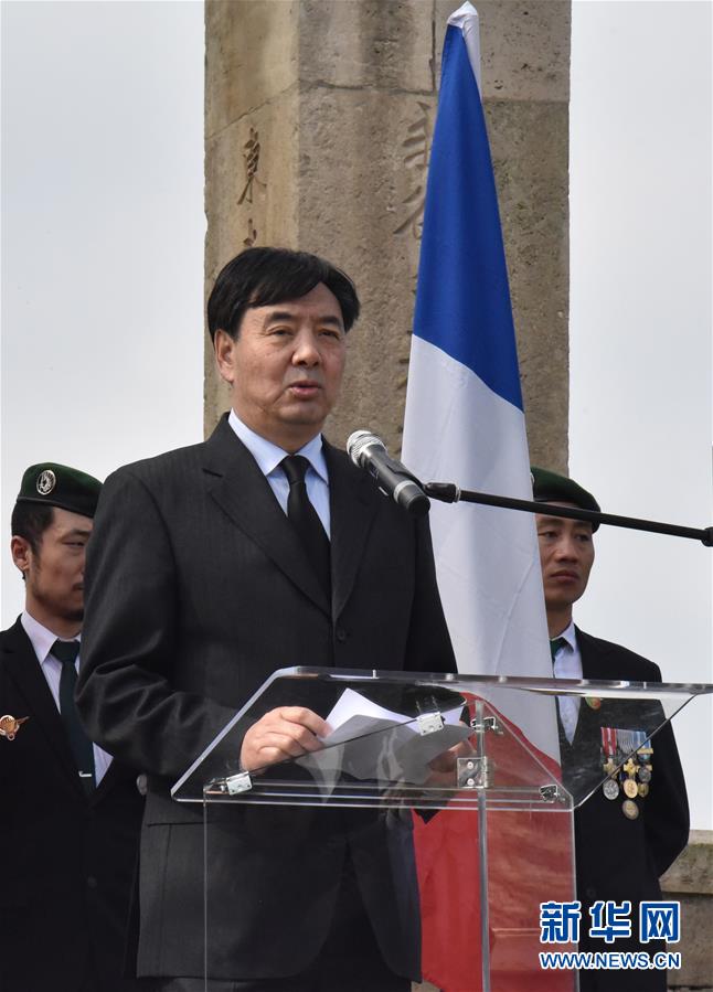 4月8日,在法國諾萊特華工墓園,中國駐法大使翟雋在祭奠儀式上發言。新華社記者吳濤 攝