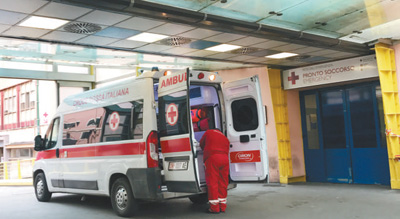 意大利羅馬一家大型綜合醫(yī)院,這里頻繁有救護(hù)車抵達(dá)運送病人。圖為其中一輛剛剛運送病人抵達(dá)急診室的急救車。記者 韓碩 攝