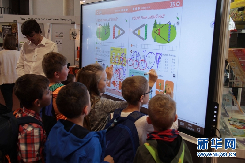 當地小學生在電子黑板上寫寫畫畫。新華網發