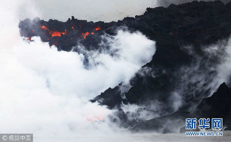 夏威夷火山熔巖流入太平洋 有毒“蒸汽云”升騰火光交映