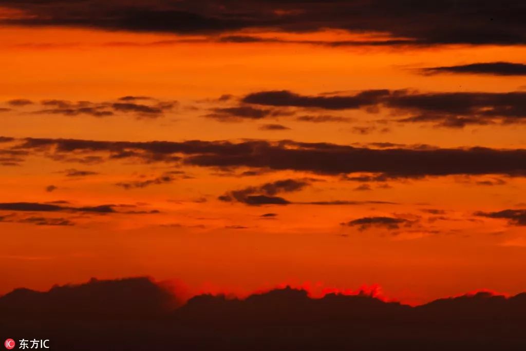 隨著暫短的陣雨飄過,外灘天空飄過美麗的紅云,一位市民正在跑步。