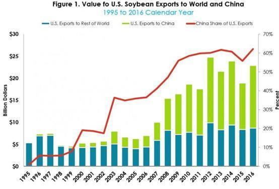 ▲圖為美國從1995年到2016年出口給全世界和中國的大豆情況,可以看到中國是美國大豆產業中最大且無法替代的市場