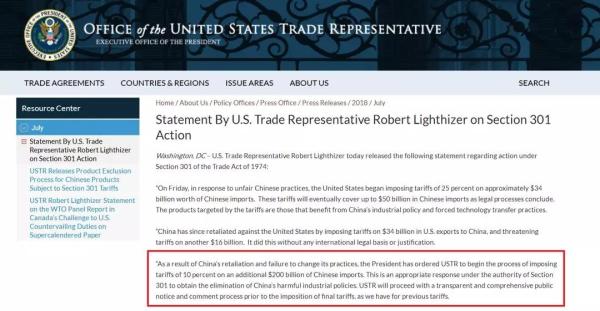 第二,強調中國不聽勸,未按其要求“限期整改”——聲明稱,過去一年,特朗普政府“耐心”敦促中國停止原有做法、開放市場、參與真正的市場競爭,并給出了“清晰和詳細”的具體改變要求,但中國“并未改變令美國經濟未來處于風險的行為”,反而開始報復美國產品,這樣做“缺乏任何國際法理基礎或理由”。所以他們覺得,原有的力度不夠了,要再加加碼,“這是美國在301條款授權下對消除中國‘有害’產業政策做出的合適回應”。(就奇怪怎么這個301條款哪兒哪兒都好使?)
