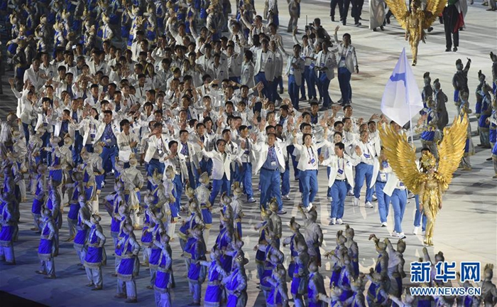 8月18日,第18屆亞運會開幕式在印度尼西亞雅加達(dá)舉行。這是朝韓兩國代表團(tuán)在開幕式上舉“朝鮮半島旗”共同入場(8月18日攝)。新華社記者潘昱龍攝