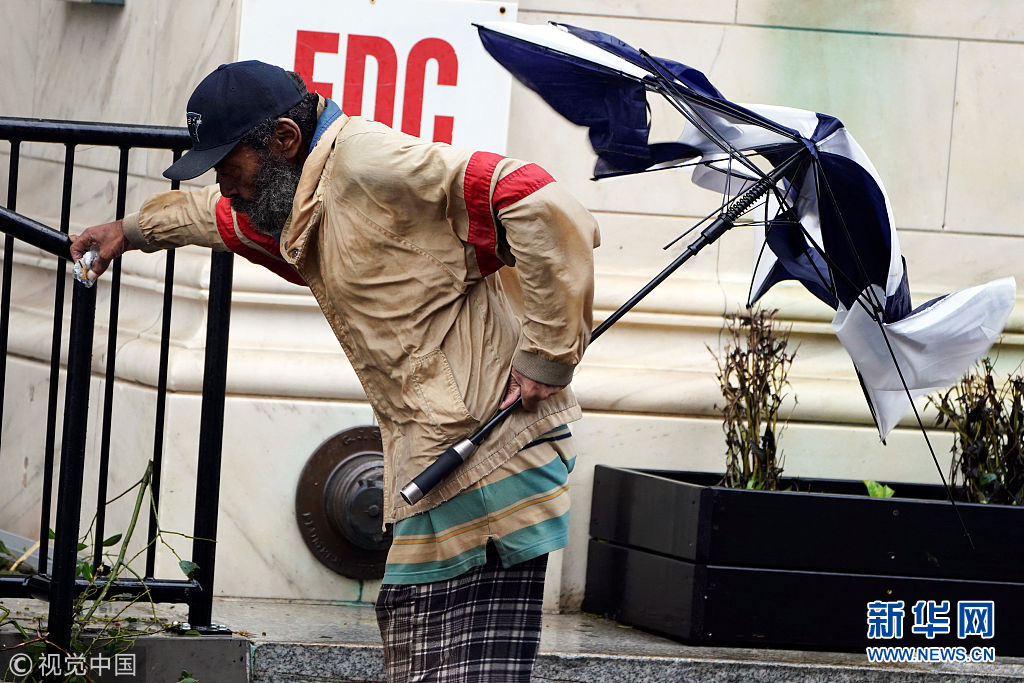 當(dāng)?shù)貢r間2018年9月15日,美國北卡羅來納州,颶風(fēng)“佛羅倫薩”在美國北卡羅來納州登陸,一名當(dāng)?shù)啬凶泳o握欄桿抵御狂風(fēng)。(圖片來源:視覺中國)