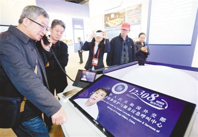 2017年10月27日,市民在北京展覽館體驗外交部全球領事保護與服務應急呼叫中心12308熱線。人民視覺