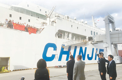 9月10日,中國駐大阪總領館工作人員把因臺風滯留日本關(guān)西國際機場的部分中國旅客送上助其返鄉(xiāng)的“新鑒真”號。資料圖片