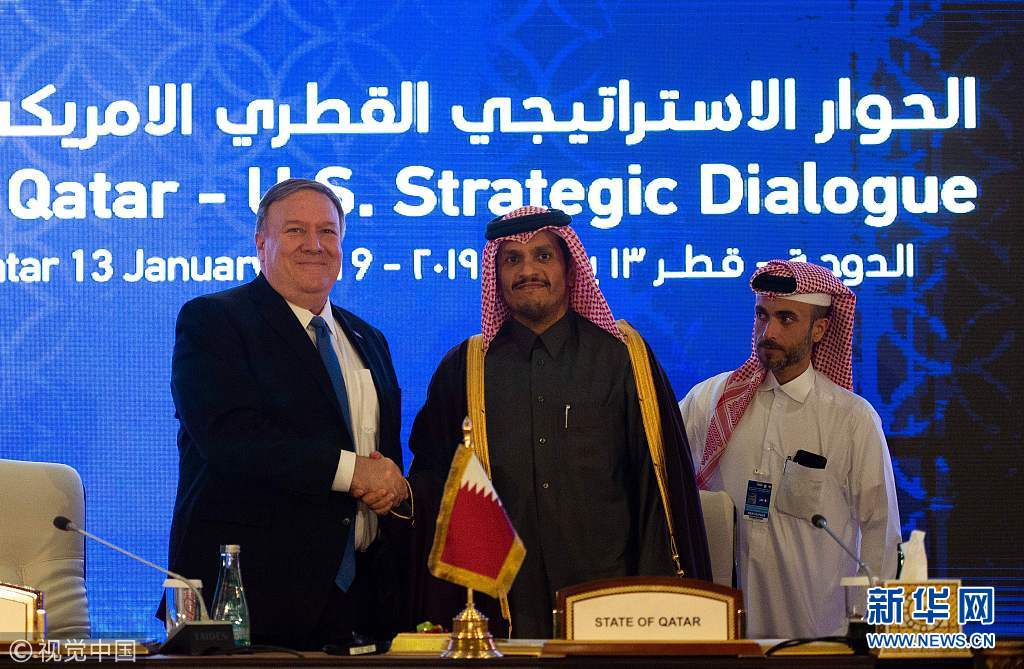 2019年1月13日,卡塔爾多哈,美國國務(wù)卿邁克·蓬佩奧訪問卡塔爾。蓬佩奧與卡塔爾副首相兼外交大臣穆罕默德在多哈的喜來登大酒店簽署了諒解備忘錄和意向聲明并舉行聯(lián)合記者會(huì)。蓬佩奧表示,兩國外交部門領(lǐng)導(dǎo)人當(dāng)天簽署了一份諒解備忘錄,將擴(kuò)建和改造烏代德美國空軍基地。(圖片來源:視覺中國)
