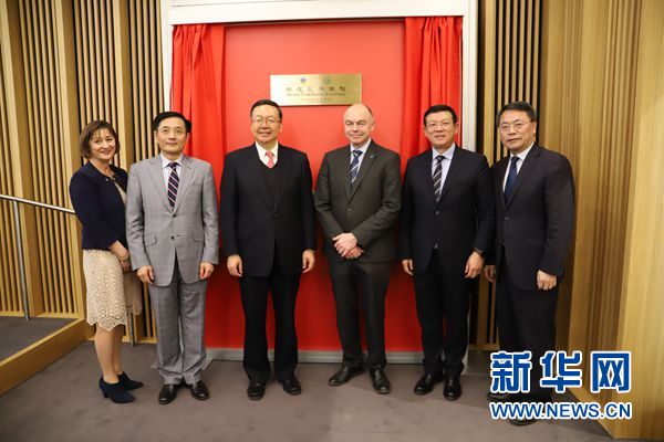 2月26日,在愛爾蘭首都都柏林,中國教育部副部長田學軍(左三)、中國駐愛爾蘭大使岳曉勇(左二)和都柏林大學校長安德魯?迪克斯(右三)等在都柏林大學示范孔子學院揭牌儀式上合影。