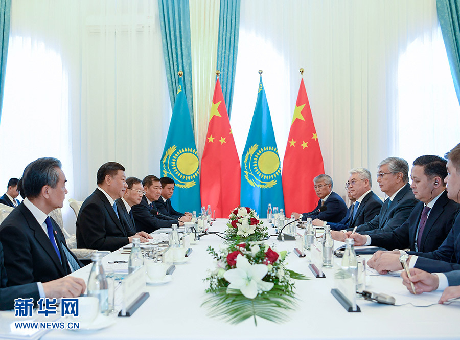 6月13日,國家主席習(xí)近平在比什凱克會(huì)見哈薩克斯坦總統(tǒng)托卡耶夫。 新華社記者 高潔 攝