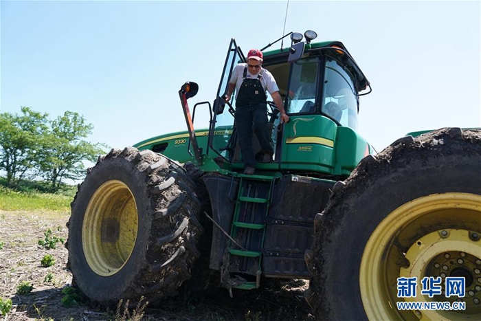 6月9日,在位于美國中部密蘇里州的小鎮奧里克,湯姆·沃特斯從一輛拖拉機上下來。新華社記者 劉杰 攝