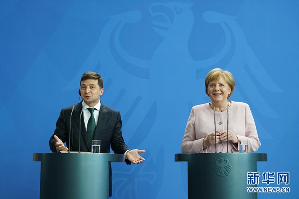 6月18日,在德國柏林,德國總理默克爾(右)與到訪的烏克蘭總統(tǒng)澤連斯基共同出席聯(lián)合記者會。新華社記者 王勍 攝