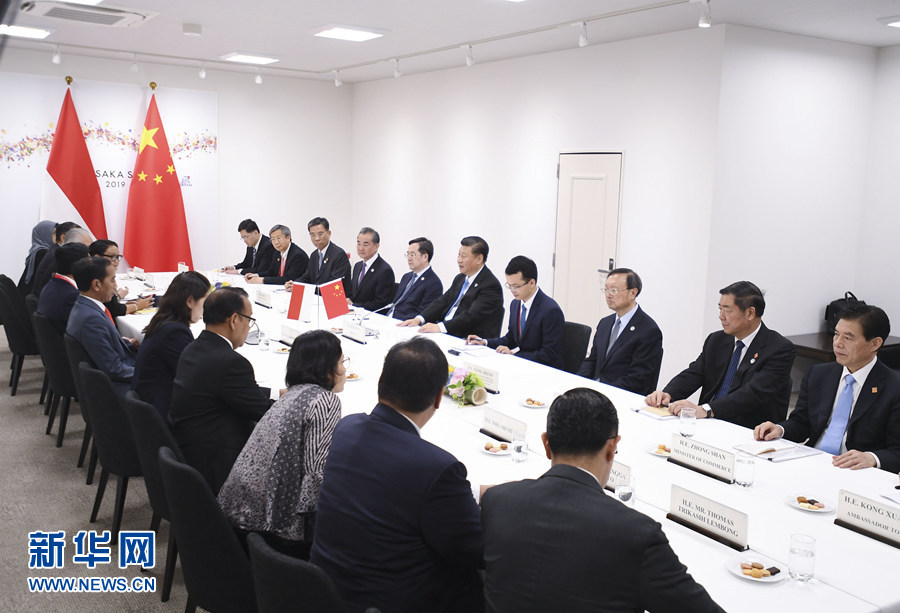 6月28日,國(guó)家主席習(xí)近平在大阪會(huì)見(jiàn)印度尼西亞總統(tǒng)佐科。 新華社記者 燕雁 攝