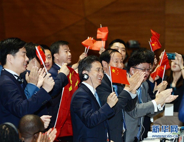 7月6日,在阿塞拜疆巴庫,中國代表團在世界遺產大會上慶祝中國良渚古城遺址申遺成功。中國良渚古城遺址6日在阿塞拜疆巴庫舉行的世界遺產大會上獲準列入世界遺產名錄。至此,中國世界遺產總數已達55處,位居世界第一。新華社發(巴巴耶夫 攝)