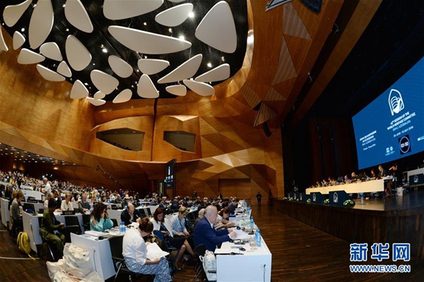這是7月5日在阿塞拜疆巴庫拍攝的世界遺產大會現場。第43屆聯合國教科文組織世界遺產委員會會議(世界遺產大會)5日在阿塞拜疆巴庫舉行,會議審議通過將中國黃(渤)海候鳥棲息地(第一期)列入世界自然遺產名錄。該項目成為中國第54處世界遺產。新華社發(巴巴耶夫 攝)