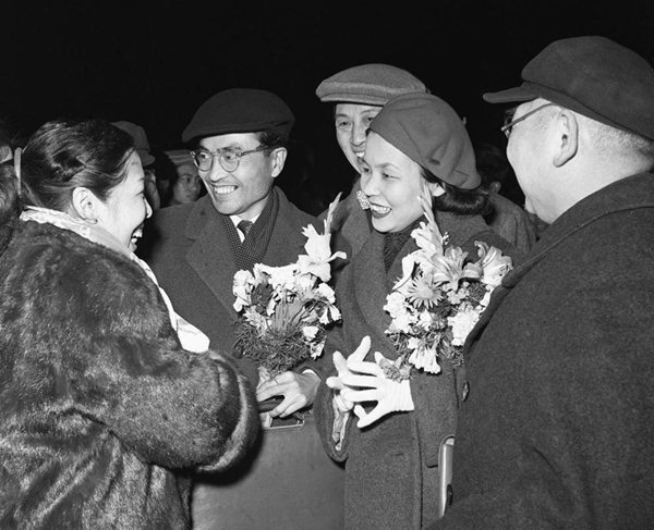 團長清水正夫(前左二)和夫人松山樹子(前左三)率領的日本松山芭蕾舞蹈團于1958年3月8日到達北京,受到首都戲劇舞蹈界人士的熱烈歡迎。新華社記者吳化學攝