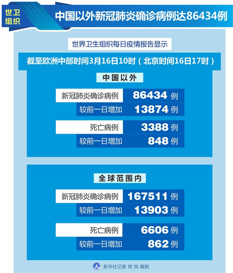 世衛組織每日疫情報告顯示,截至歐洲中部時間16日10時(北京時間16日17時),中國以外新冠肺炎確診病例較前一日增加13874例,達到86434例;中國以外死亡病例較前一日增加848例,達到3388例。