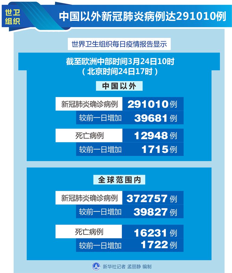 新華社日內瓦3月24日電(記者劉曲)世界衛生組織24日公布的最新數據顯示,中國以外新冠肺炎確診病例達到291010例。