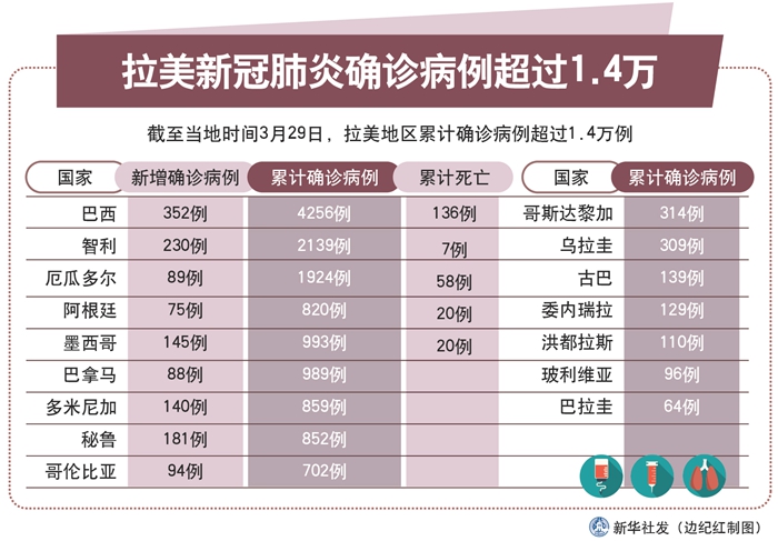 新華社巴西利亞3月29日電 綜合新華社駐拉美地區記者報道:拉美地區新冠肺炎疫情持續加劇。截至29日,拉美地區累計確診病例超過1.4萬例,其中巴西和智利分別超過4000例和2000例。玻利維亞當日報告首例死亡病例。