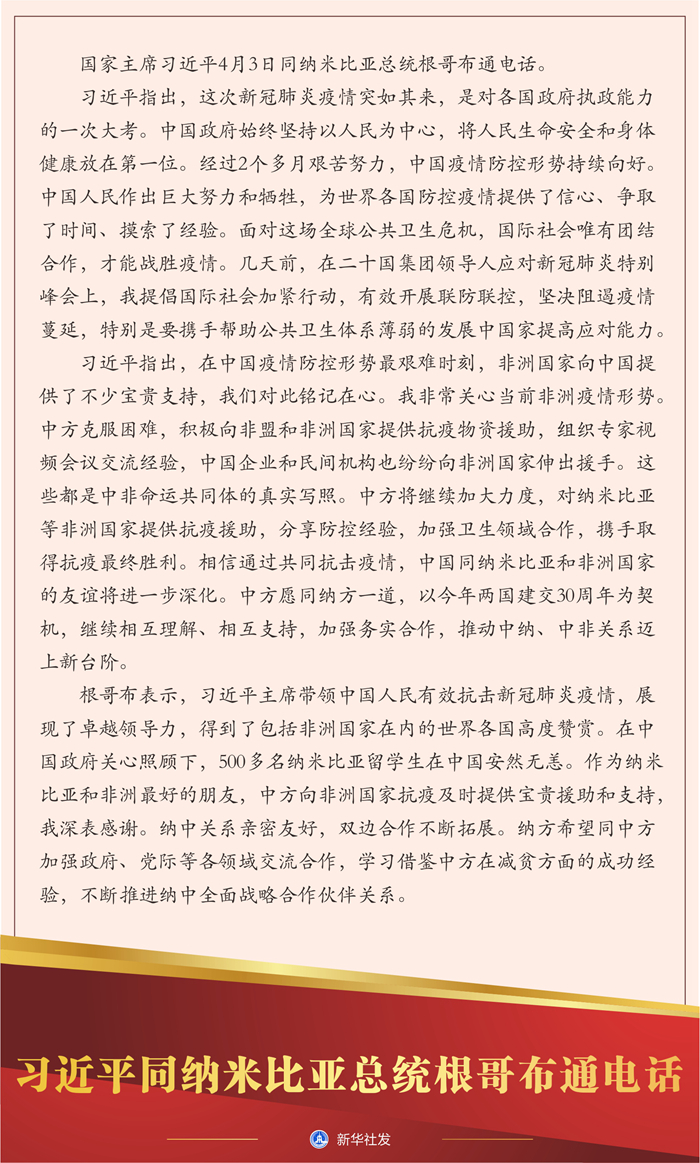 習近平指出,在中國疫情防控形勢最艱難時刻,非洲國家向中國提供了不少寶貴支持,我們對此銘記在心。我非常關心當前非洲疫情形勢。中方克服困難,積極向非盟和非洲國家提供抗疫物資援助,組織專家視頻會議交流經驗,中國企業和民間機構也紛紛向非洲國家伸出援手。這些都是中非命運共同體的真實寫照。中方將繼續加大力度,對納米比亞等非洲國家提供抗疫援助,分享防控經驗,加強衛生領域合作,攜手取得抗疫最終勝利。相信通過共同抗擊疫情,中國同納米比亞和非洲國家的友誼將進一步深化。中方愿同納方一道,以今年兩國建交30周年為契機,繼續相互理解、相互支持,加強務實合作,推動中納、中非關系邁上新臺階。
