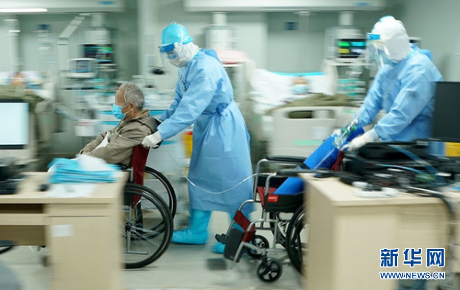 3月20日,武漢火神山醫院重癥醫學一科副主任宋立強(中)護送81歲的新冠肺炎重癥患者去做CT檢查。為確保患者有充足供氧,醫生胡世頡推著氧氣瓶隨行。新華社記者 王毓國 攝