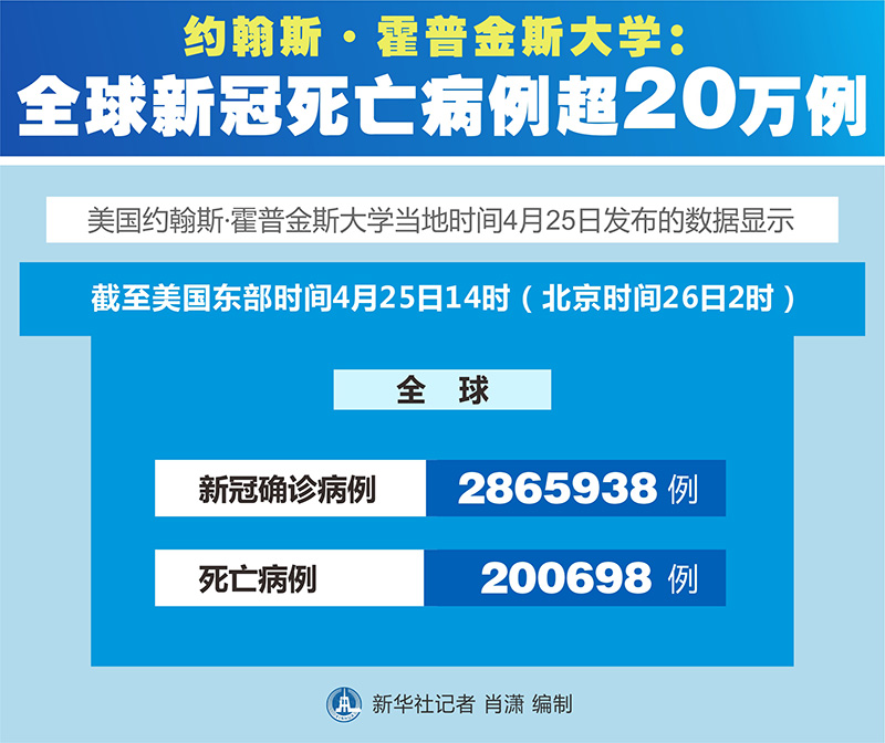 新華社紐約4月25日電? 美國約翰斯·霍普金斯大學25日發布的新冠疫情最新統計數據顯示,全球新冠死亡病例超過20萬例。
