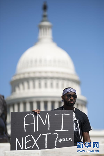 5月30日,在美國首都華盛頓國會山附近,一名男子手持標(biāo)語參加抗議活動。 新華社記者 劉杰 攝