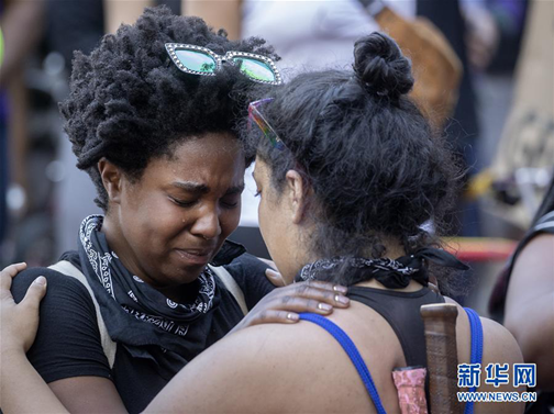 5月28日,在美國明尼阿波利斯市,抗議者集會時相互擁抱。新華社/美聯(lián)